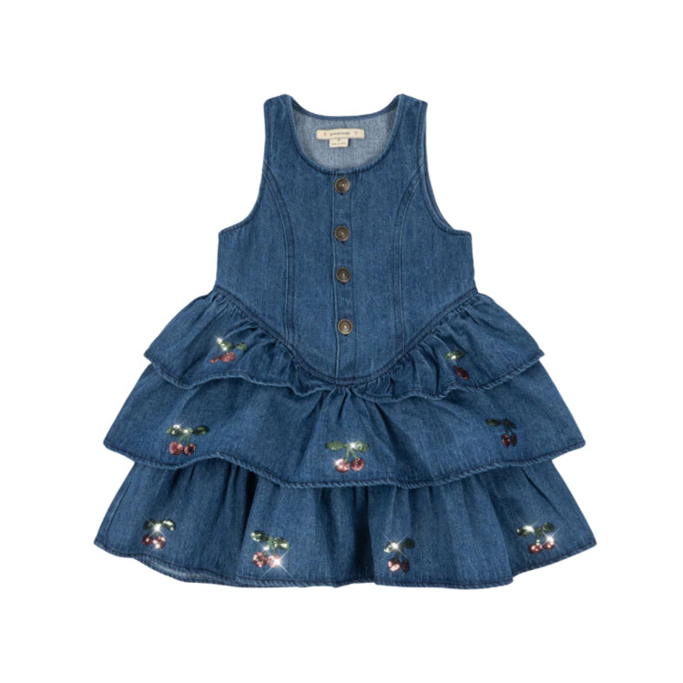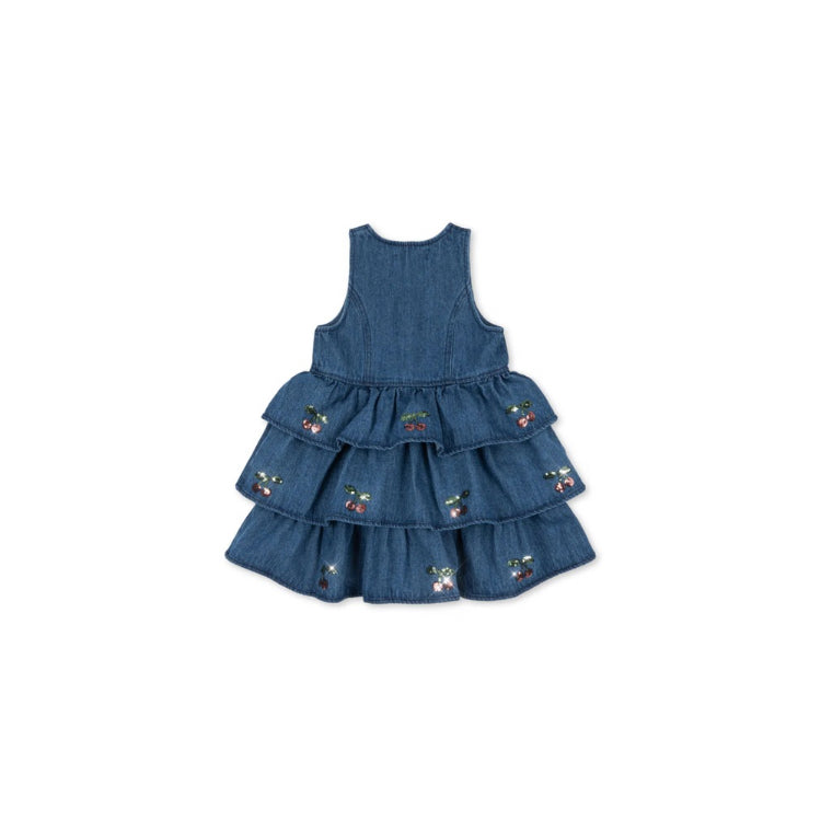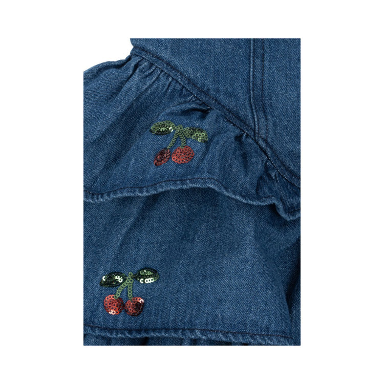 Dieses charmante Jeanskleid von Konges Sløjd besticht durch seinen mehrstufigen Rock mit verspielten, bestickten Paillettenkirschen – ein liebevolles Detail, das Persönlichkeit ausstrahlt. Der klassische Rundhalsausschnitt und der praktische Knopfverschluss machen das Anziehen zum Kinderspiel. In elegantem Denim Blue präsentiert sich das ELBA als vielseitiger Begleiter für jeden Tag – ob beim Spielen im Park oder bei besonderen Anlässen. Die hochwertige Verarbeitung und das durchdachte Design sorgen für Tragekomfort und Langlebigkeit, die über mehrere Jahreszeiten hinweg Freude bereitet.
