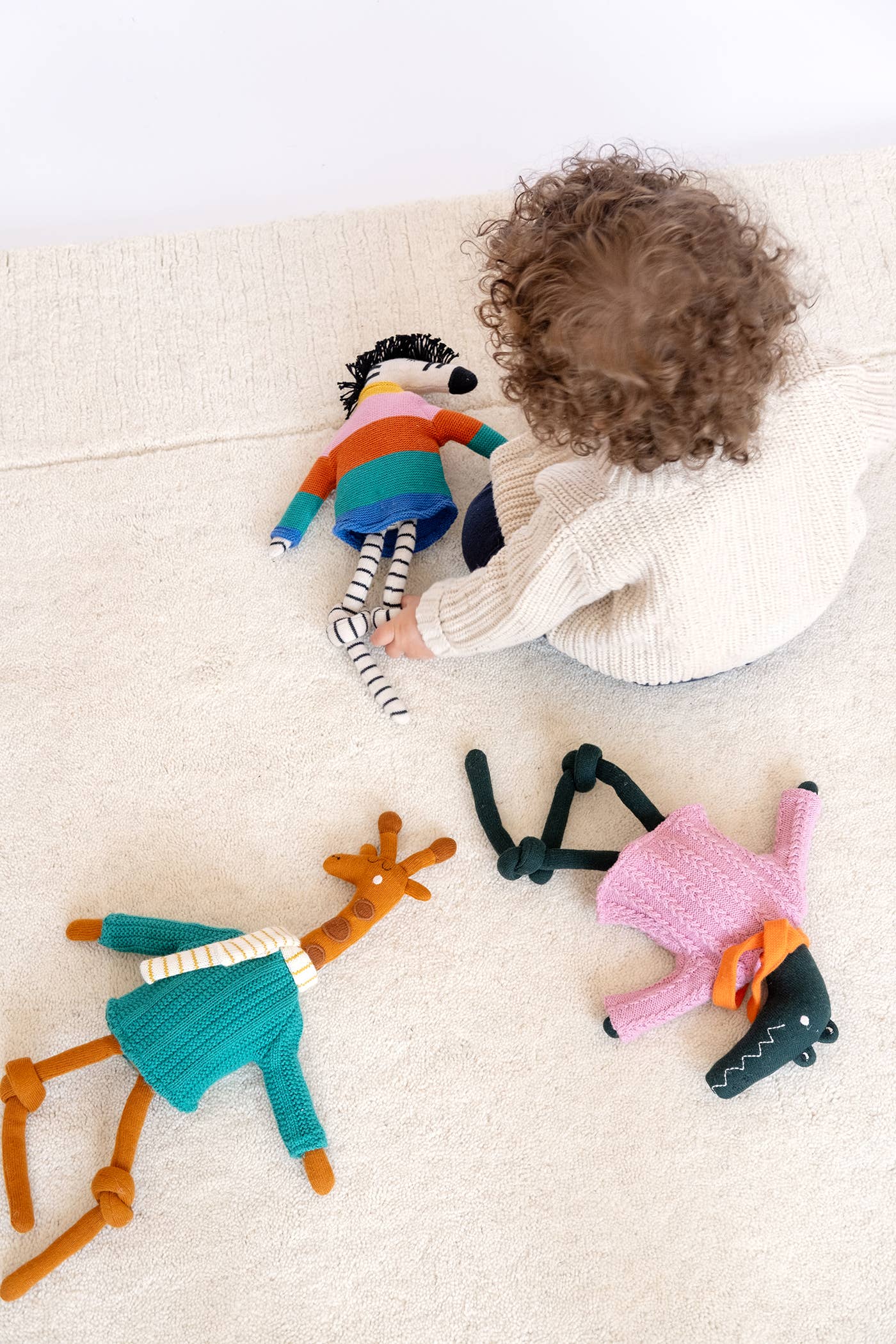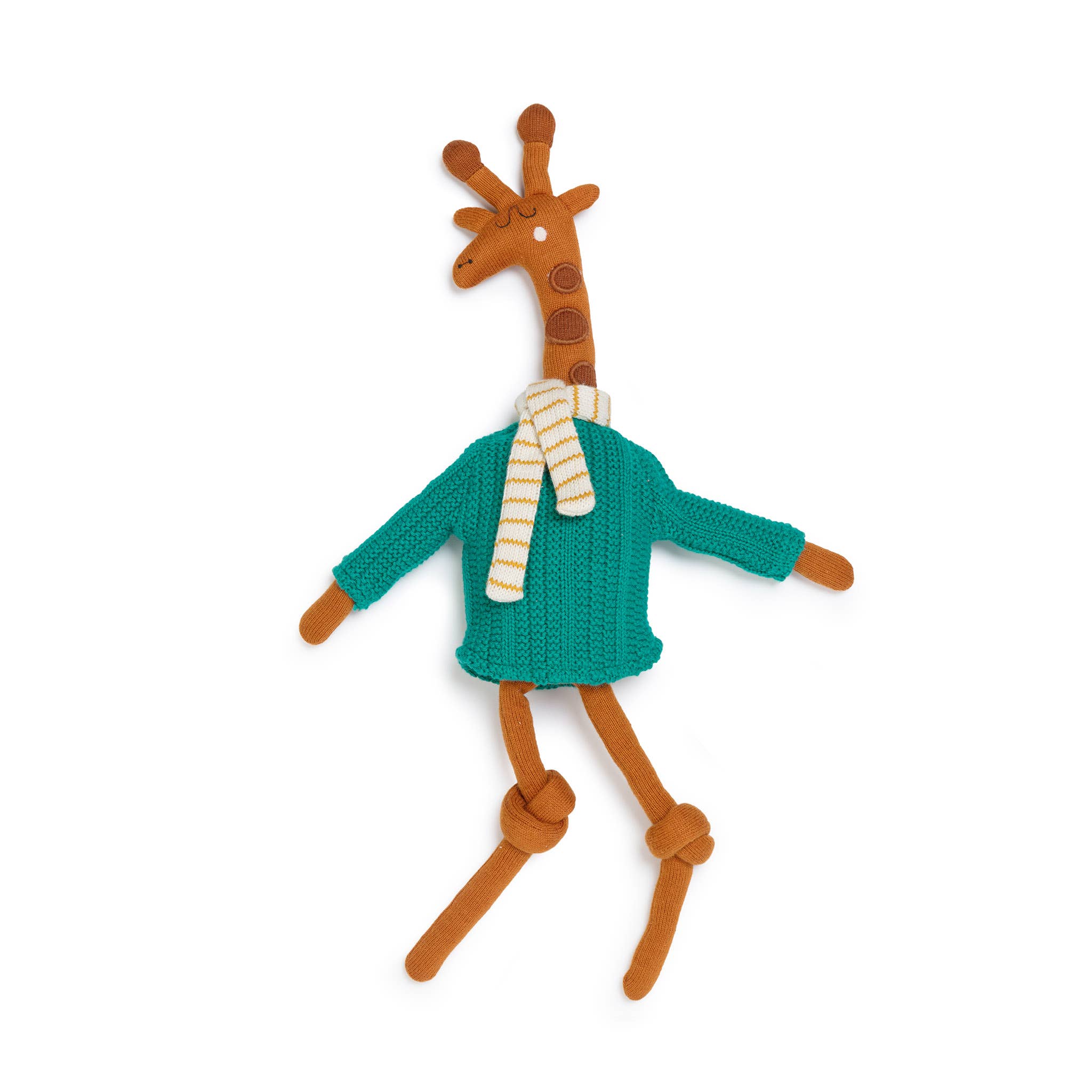 Die neueste Ergänzung der Ragdoll-Crew: eine liebevoll gestaltete Giraffenpuppe aus weichem Baumwollstrick. Sie trägt einen abnehmbaren Pullover im grünen Zopfmuster und einen gestreiften gelben Schal – perfekt für kleine Abenteuer. Das weich bestickte Gesicht, die gefüllten Beine mit geknoteten Knien und die angenehme Haptik machen sie zu einem treuen Begleiter für Kinder jeden Alters.