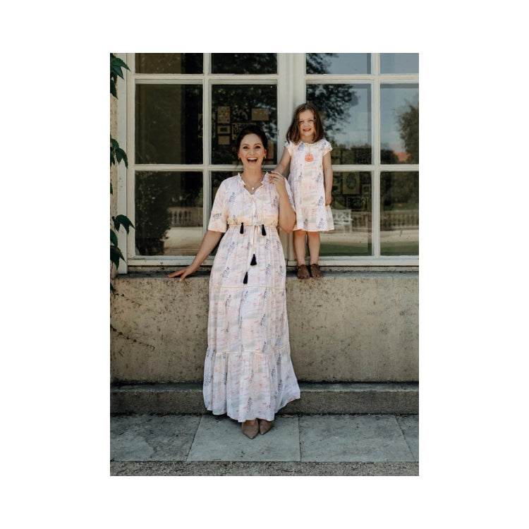 Das lange Mara Mea Kleid EARLY BIRD besticht durch seinen eleganten, modischen Print und lässt sich dank des Gürtels perfekt an jede Figur anpassen – ideal für Schwangerschaft und darüber hinaus. Die stilvolle Länge und die schwarzen Quasten am Gürtel setzen besondere Akzente und machen es zum perfekten Begleiter für festliche Anlässe. Die versteckte Knopfleiste am Dekolleté ermöglicht ein diskretes und einfaches Stillen, ohne den Look zu beeinträchtigen. Ein zeitloses Kleid, das Komfort und Stil vereint. Ebenso als supersüßes Mini-Me-Kleid erhältlich. Der absolute Hingucker.