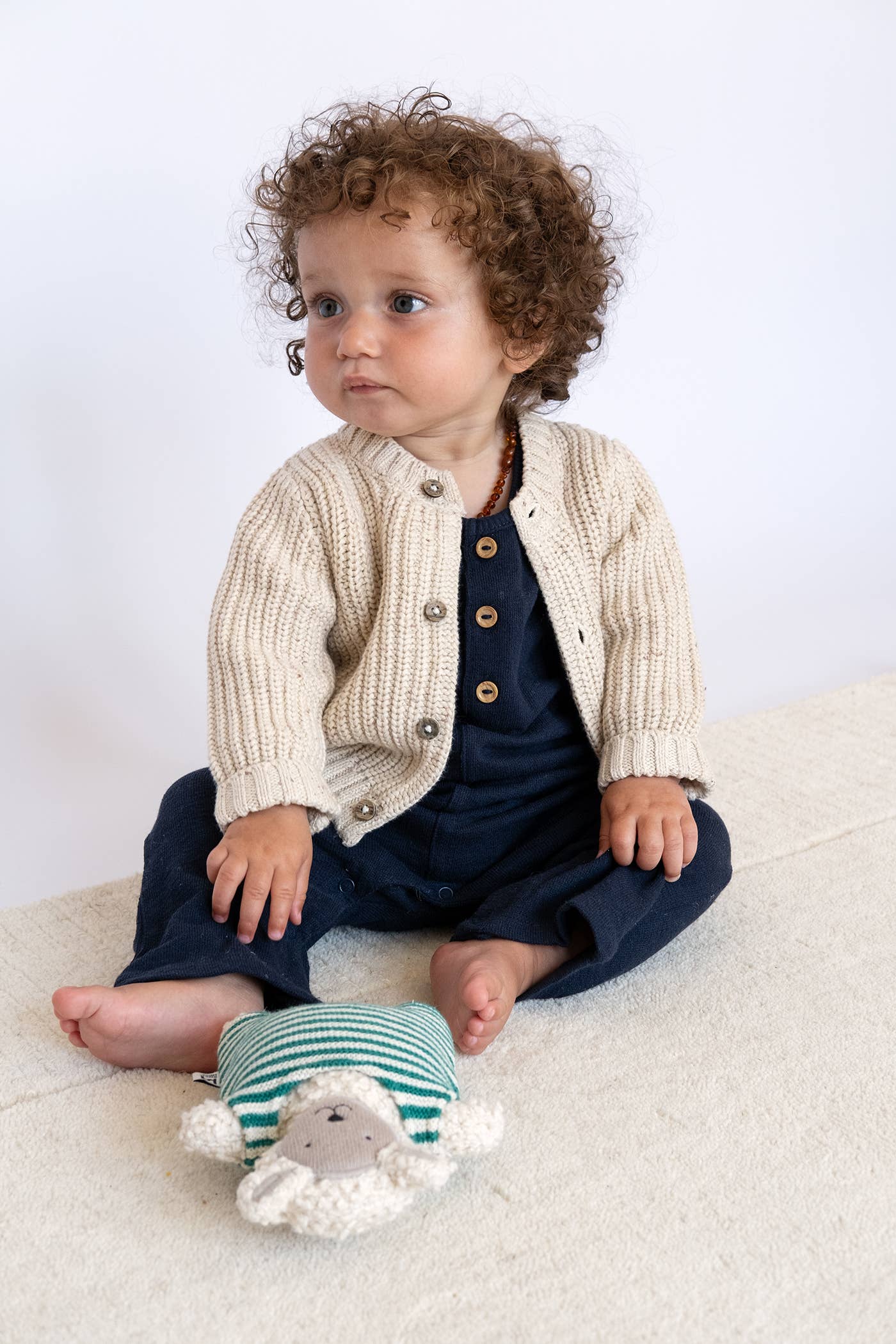 Dieses liebevoll gestaltete Kuscheltier-Schaf verbindet modernes Design mit weicher Haptik. Der Körper aus Baumwollstrick zeigt charmante Bouclé-Texturen und trägt einen gestreiften grünen Strampler. Dank des sanft beschwerten, mit Bohnen gefüllten Körpers liegt das Schaf angenehm in kleinen Händen und regt zu sensorischem, fantasievollem Spielen an.