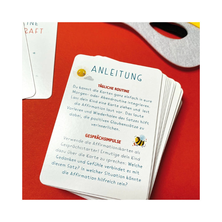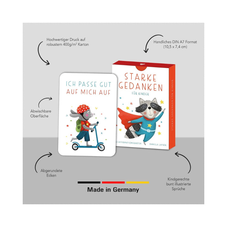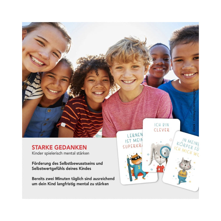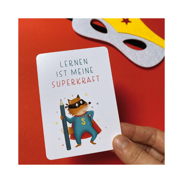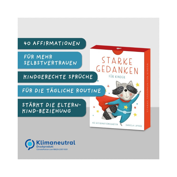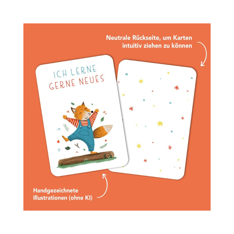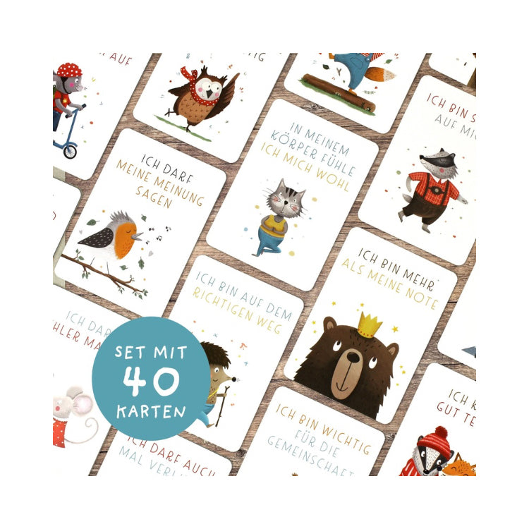 Stärke das Selbstbewusstsein deines Kindes mit unseren Affirmationskarten „Starke Gedanken". Jede Karte trägt eine ermutigende, altersgerechte Botschaft und wird von einer zauberhaften handgezeichneten Waldtier-Illustration begleitet. Die liebevollen Designs helfen Kindern, positive Gedanken zu verinnerlichen und Herausforderungen mit mehr Zuversicht zu meistern. Perfekt für tägliche Rituale, Schulpausen oder ruhige Momente – diese Karten verwandeln kleine Superkräfte in greifbare Kraft für den Alltag.