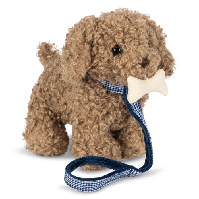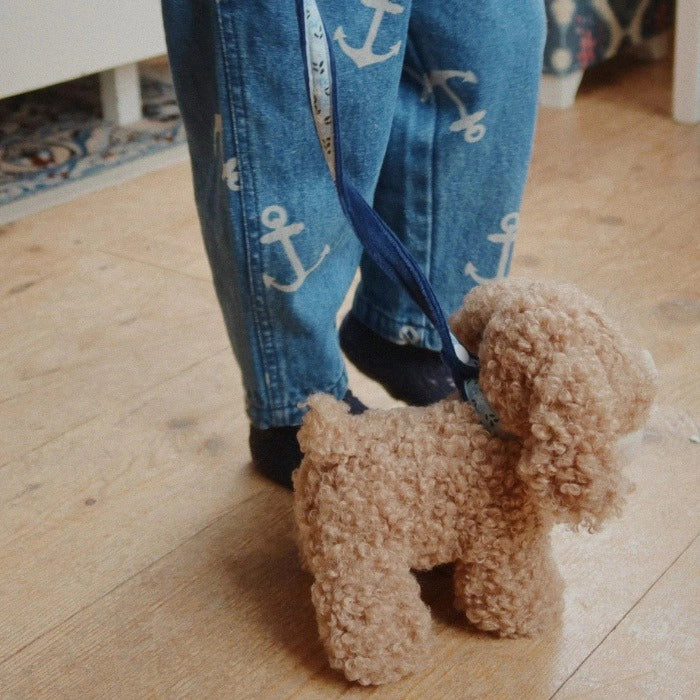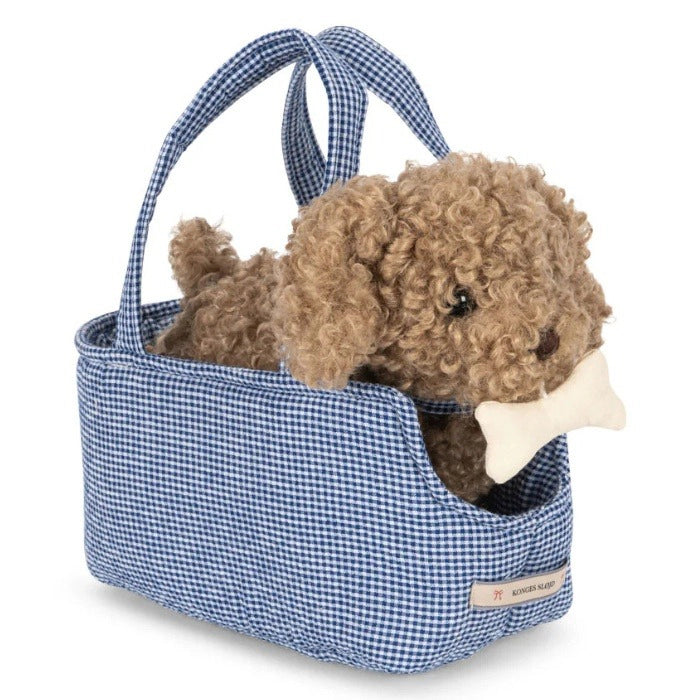 Die dazugehörige Babytragetasche präsentiert sich in einem hübschen blau-karierten Stoff im charakteristischen Vintage-Look von Konges Slojd. Mit der praktischen Leine und dem beiliegenden Kauspielzeug in Knochenform wirkt Lulu wie ein echtes Hündchen, das umsorgt und verwöhnt werden möchte.
