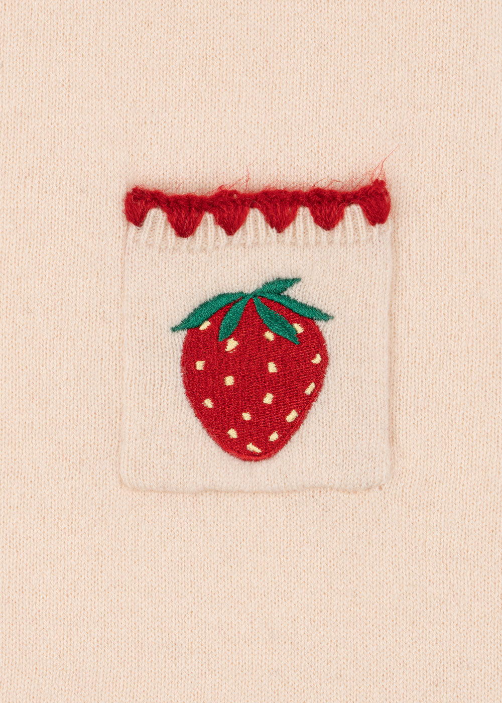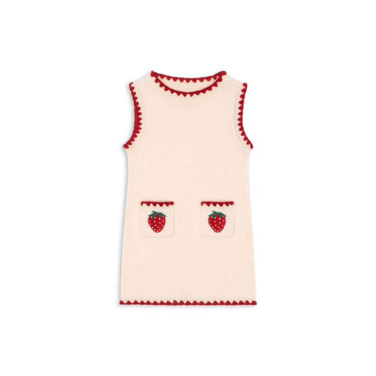Elegantes Strickkleid COLLETTE von Konges Sløjd in zartem Buttercream. Der geschmeidige Stoff schmiegt sich angenehm an, während die dezente Erdbeeren-Stickerei einen charmanten Akzent setzt. Praktische aufgesetzte Taschen und die gerade, taillierte Schnittform verleihen diesem Piece zeitlose Eleganz und Alltagstauglichkeit.
