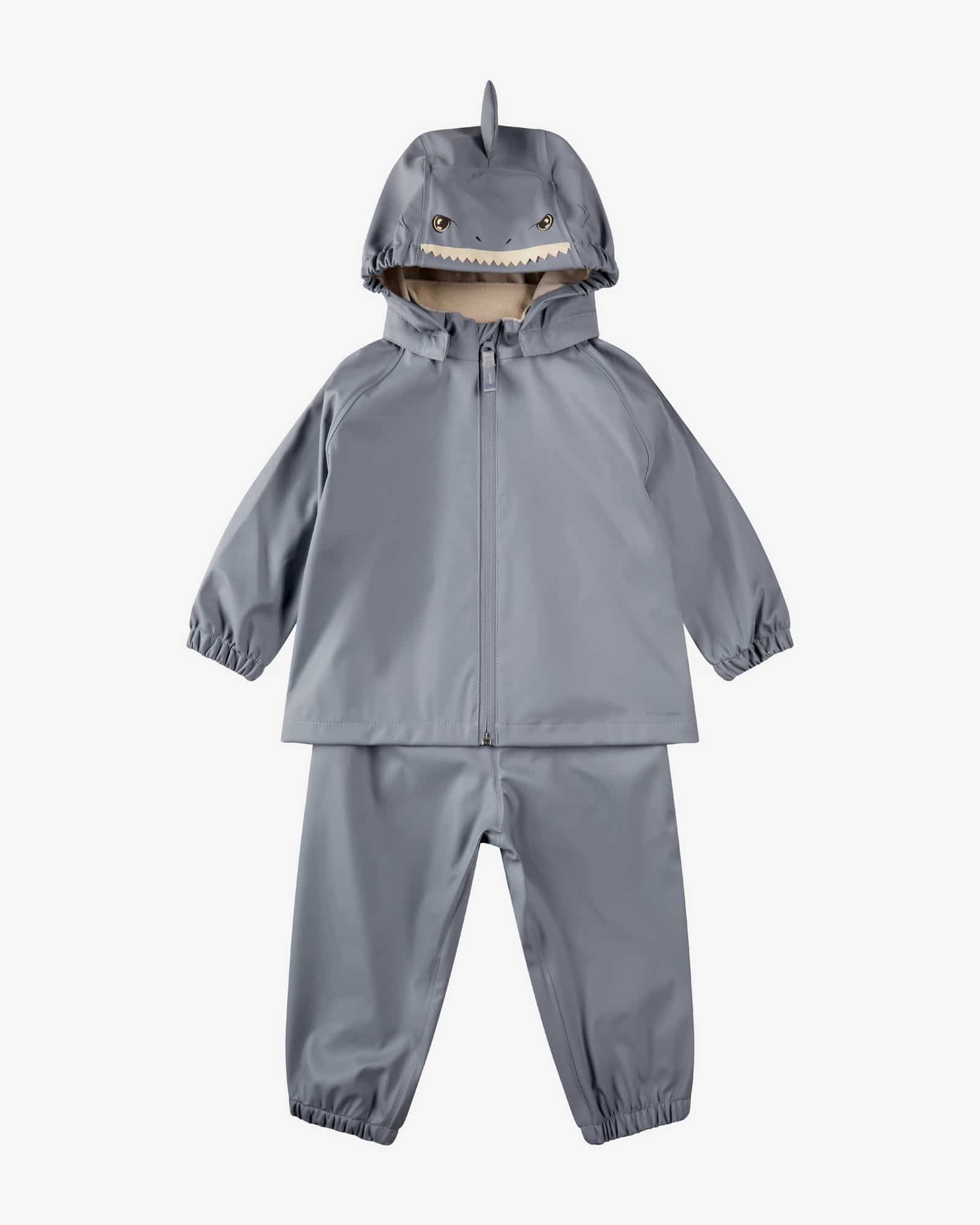 Klassische, leichte Regenjacke aus robustem, wasserdichtem PU von Konges Sløjd – ideal für Kindergarten und Kita. Der gerade Schnitt und das fröhliche Hai-Muster sorgen dafür, dass selbst graue Regentage Spaß machen.